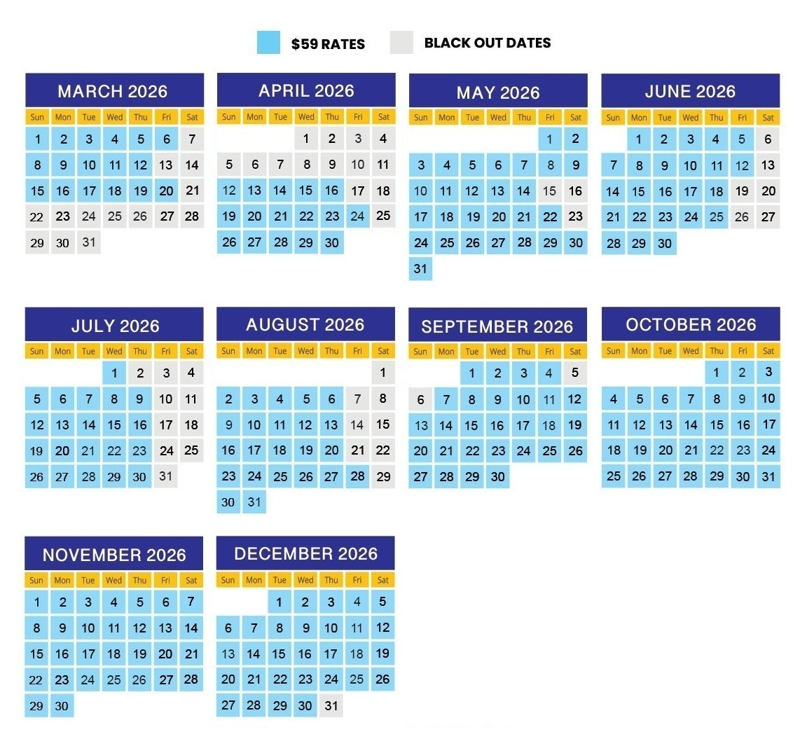 - $59 Rates Taxes & Park Tickets Included (Rates Based on 2 Guests)*