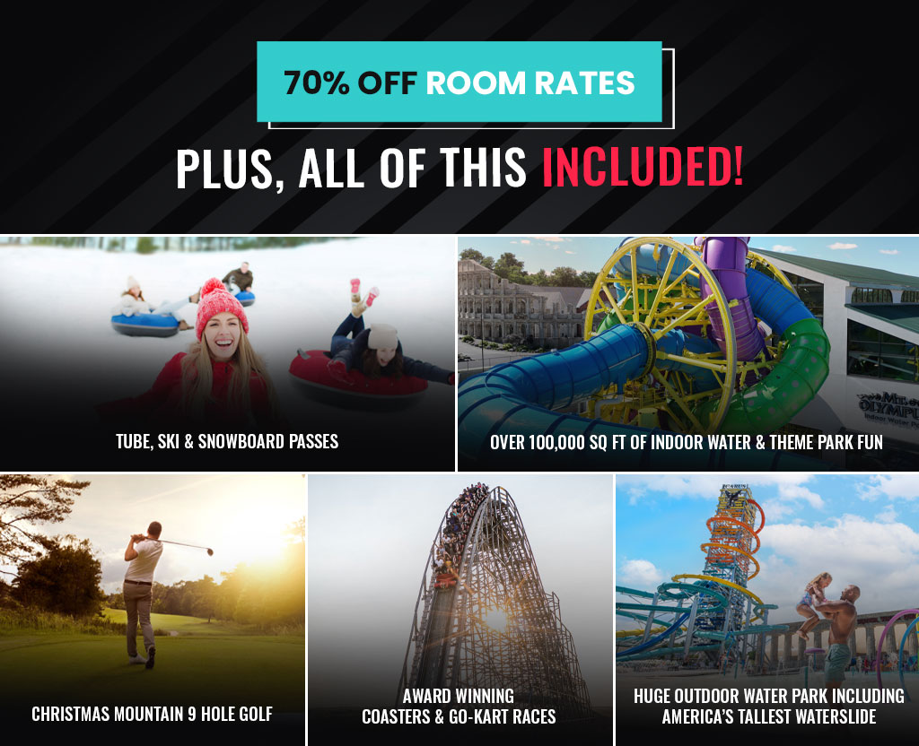 - Huge Outdoor Water Park including America’s Tallest Waterslide! (Open Mid-May through Mid-Sept.)