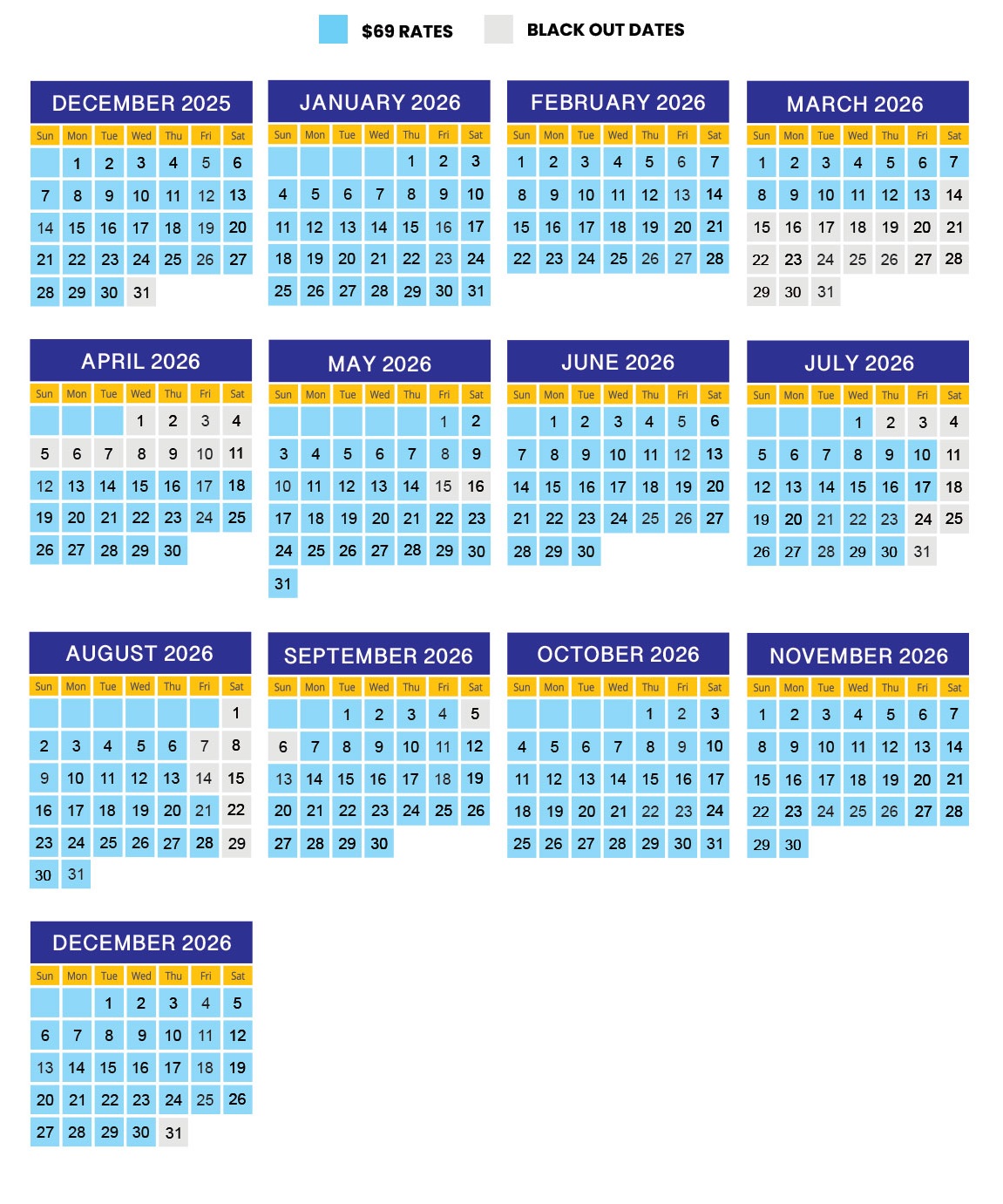 - $69 Rates Includes Taxes & Fees (Rates Based on 4 People)**
