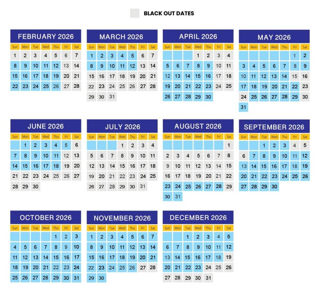 *Once you have purchased your Water and Theme Park tickets, you will receive an email confirmation that includes your FREE 2 Queen Beds Themed Room. Blackout restrictions apply (please see the blackout calendar below). This promotion is not valid on previously purchased park tickets. Hotel room tax is due at the time of check-in and will be calculated based on the hotel room’s standard selling price for the selected date.
